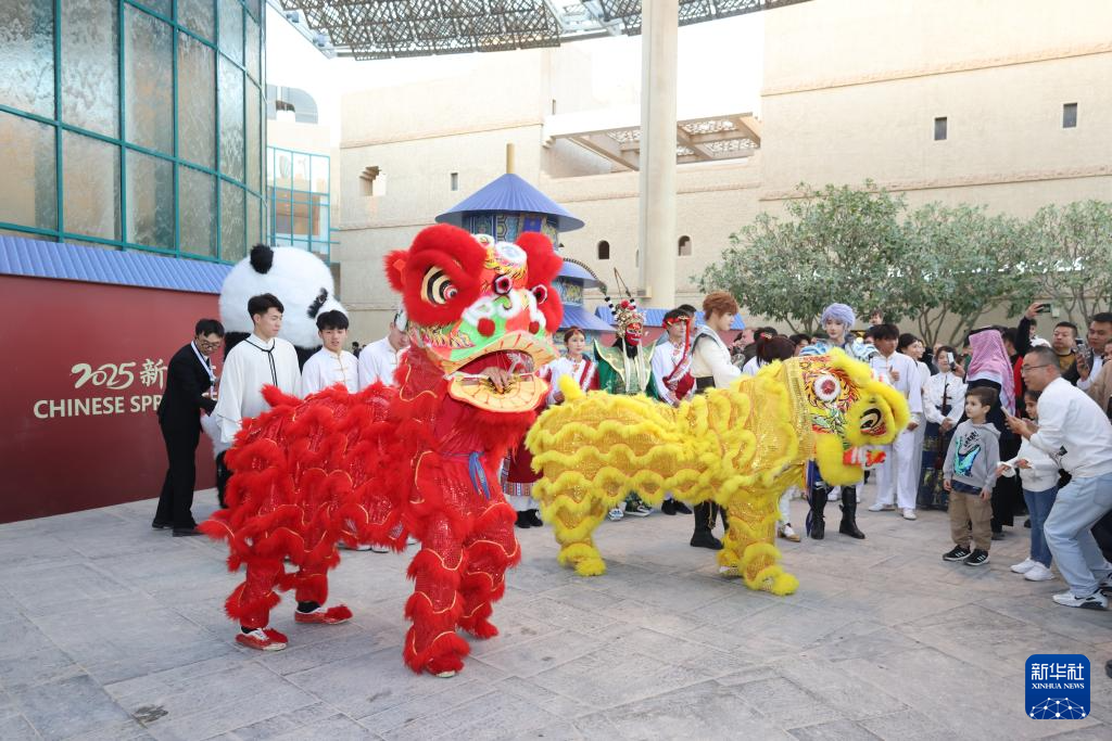 1月10日,在沙特阿拉伯首都利雅得文化宮舉行的“新春大集”活動上,演員表演舞獅。
