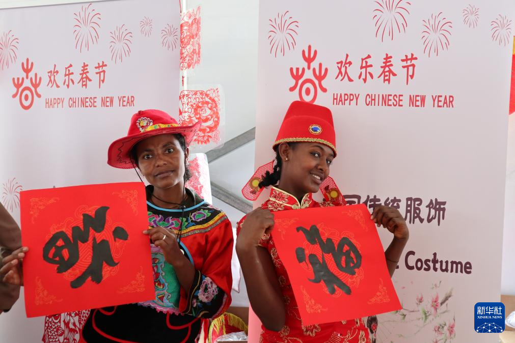 1月12日,在埃塞俄比亞首都亞的斯亞貝巴友誼廣場,當地市民在“慶祝中埃塞建交55周年暨歡樂春節活動”現場試穿中國傳統服裝并拍照留念。