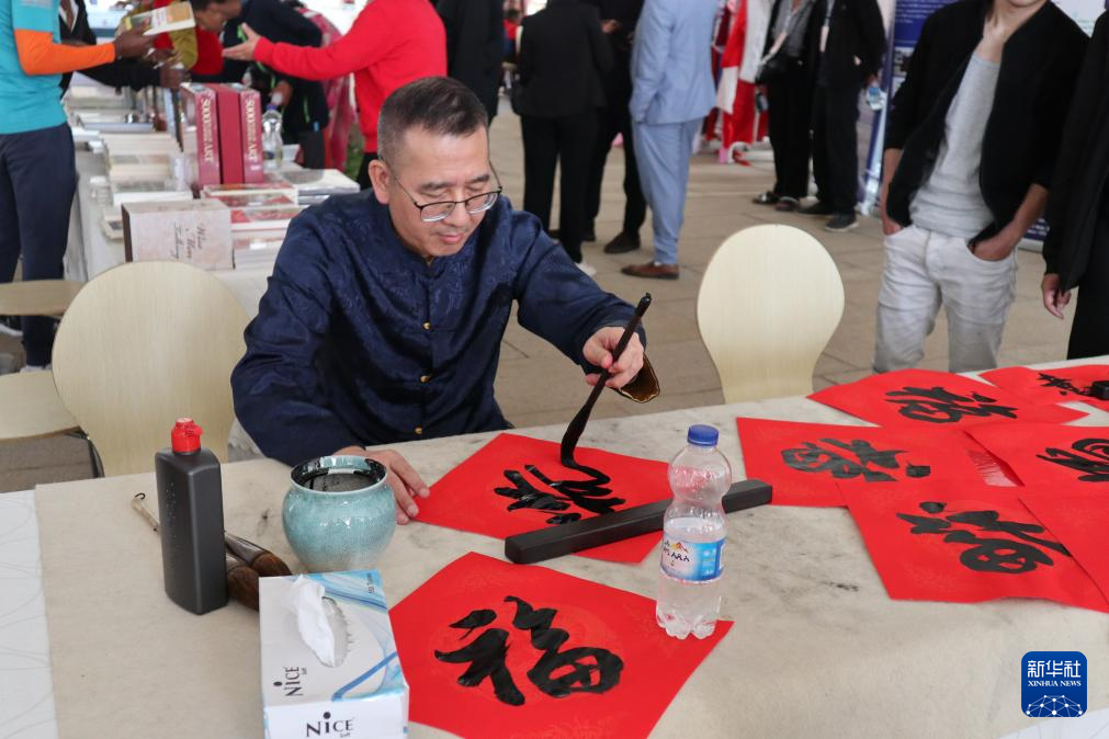 1月12日,在埃塞俄比亞首都亞的斯亞貝巴友誼廣場,中國土木埃塞俄比亞工程有限公司的工作人員在“慶祝中埃塞建交55周年暨歡樂春節活動”現場表演書法。