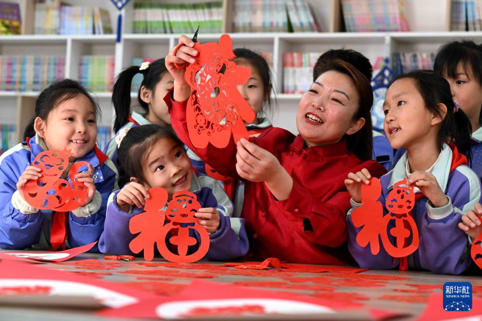 1月13日,剪紙藝人在河北省石家莊市天苑小學教孩子們剪窗花。