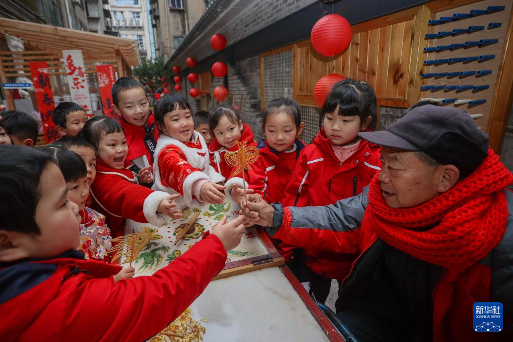 1月13日,在四川省遂寧市船山區順城街幼兒園舉辦的新春廟會上,孩子們圍觀糖畫制作。