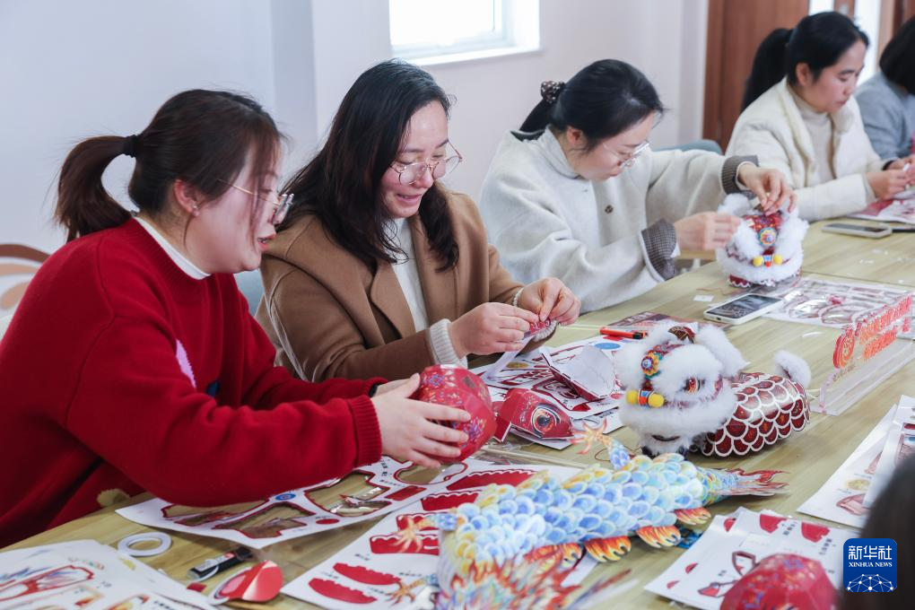 1月14日,在浙江省嘉興市南湖區建設街道子城社區民族之家內,居民在制作醒獅燈籠。