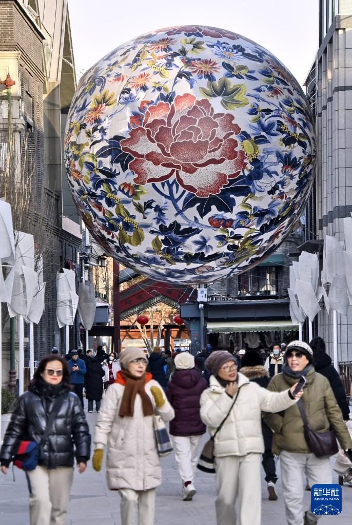 前門商業區的北京坊安裝了巨型的牡丹花燈,吸引了大批游客前來觀賞(1月13日攝)。