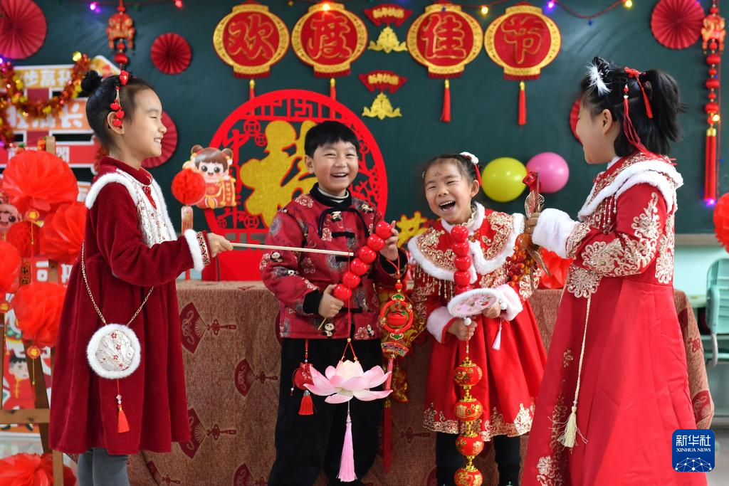 1月14日,在山東青島北仲路第二小學開展的“國風古韻”迎新春主題活動上,學生們登臺表演過年習俗。