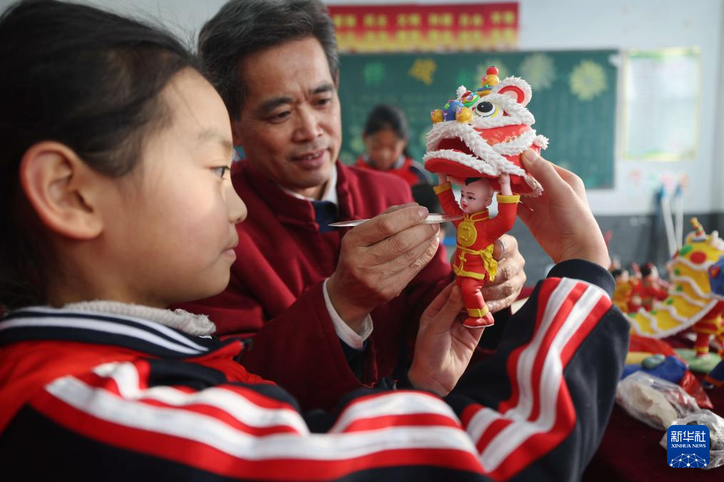 1月14日,在山東省臨沂市沂南縣銅井鎮魯家莊中心小學開展的“巧手面塑迎新年”活動中,一名小學生在面塑技藝傳承人左安勝的指導下對面塑作品精雕細琢。