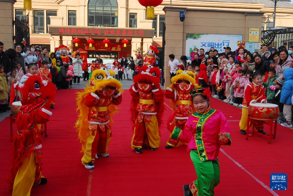 1月13日,在山東省青島市即墨區皋虞路幼兒園舉行的“趕年貨大集 品童趣年味”活動中,孩子們舞獅迎新春。