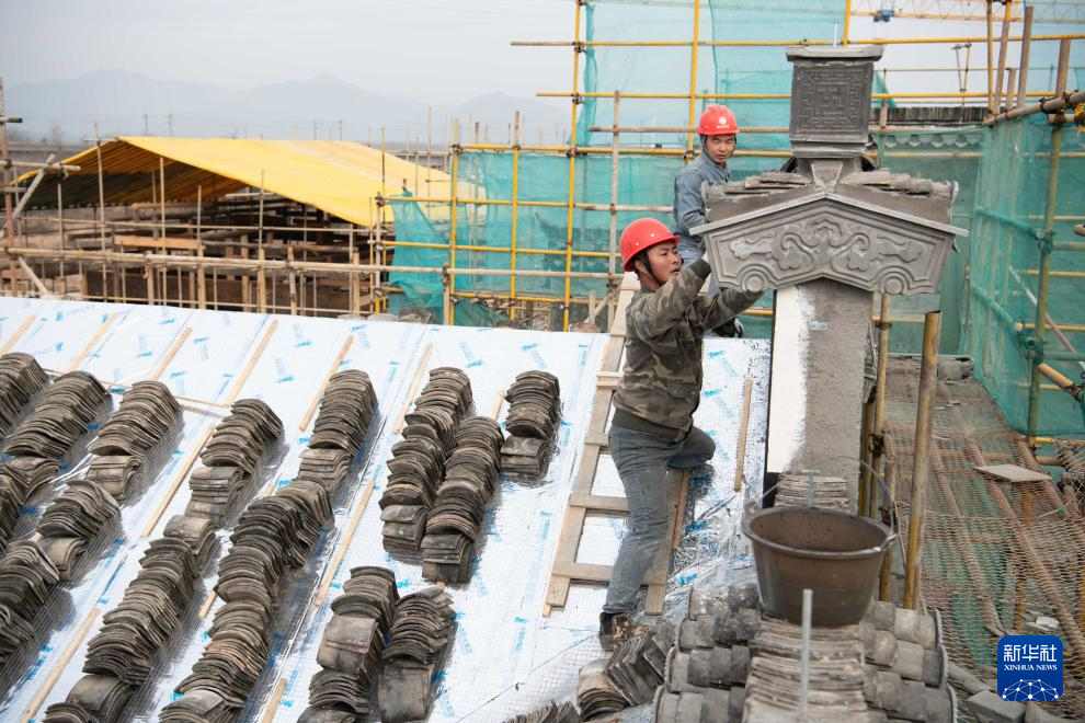 1月6日,工人在黃山徽匠園林古建有限公司廠區搭建徽派仿古建筑。