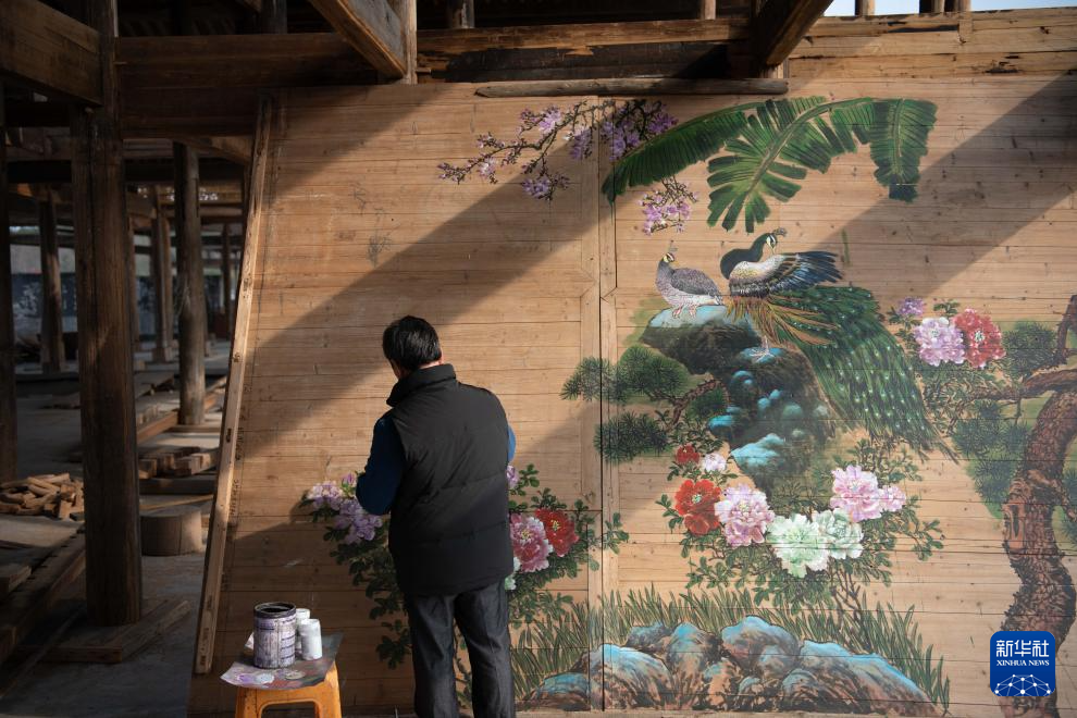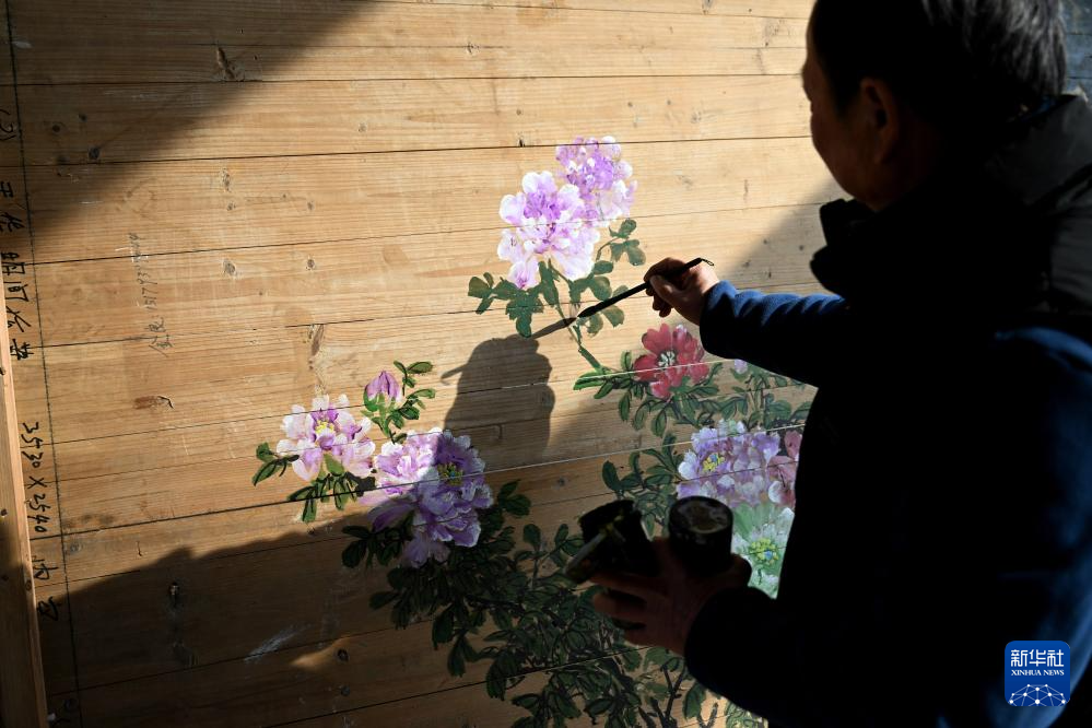 1月6日,在黃山徽匠園林古建有限公司廠區,工匠應中秋在徽派仿古建筑的構件上進行彩繪。