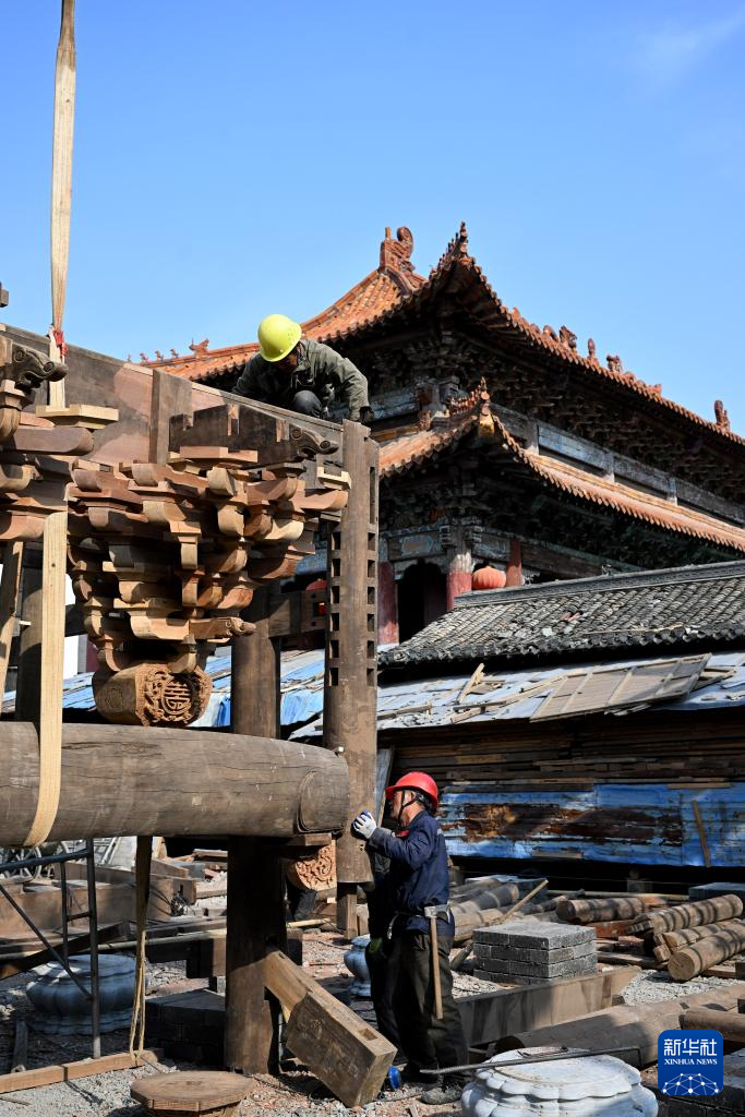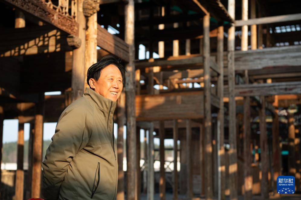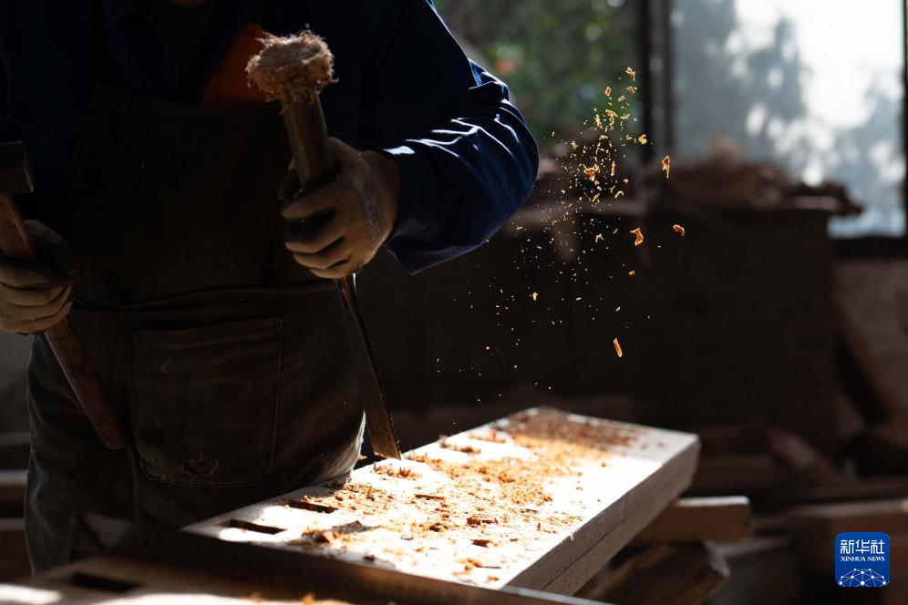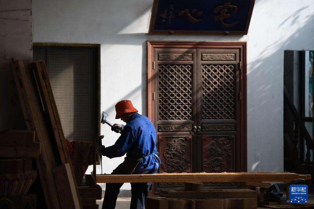 1月8日,在安徽省黃山市休寧縣,工人在一處傳統徽派古民居復建工地現場進行木料加工。