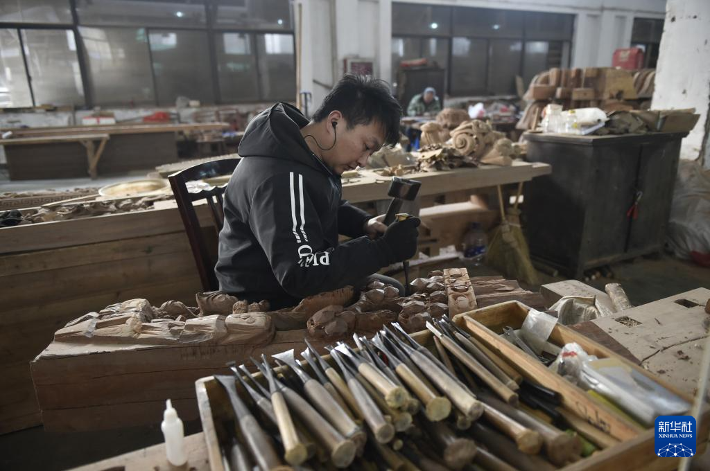 1月6日,工匠在黃山徽匠園林古建有限公司廠區雕刻徽派仿古建筑構件。