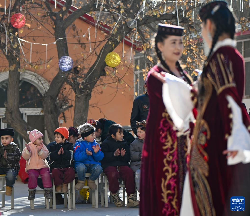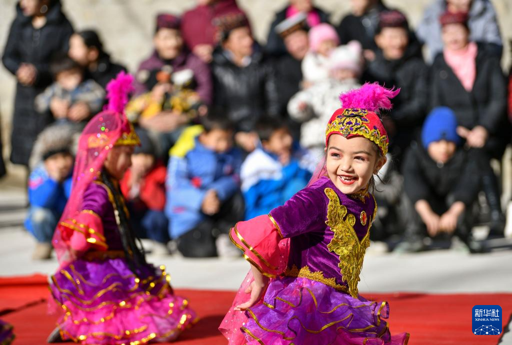 村民在大同鄉阿依克日克村小廣場上觀看由大同鄉庫如克蘭干村小朋友表演的舞蹈《春天的花》(1月7日攝)。