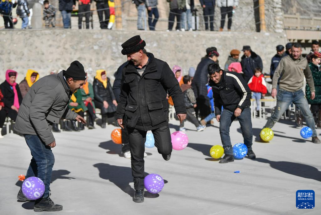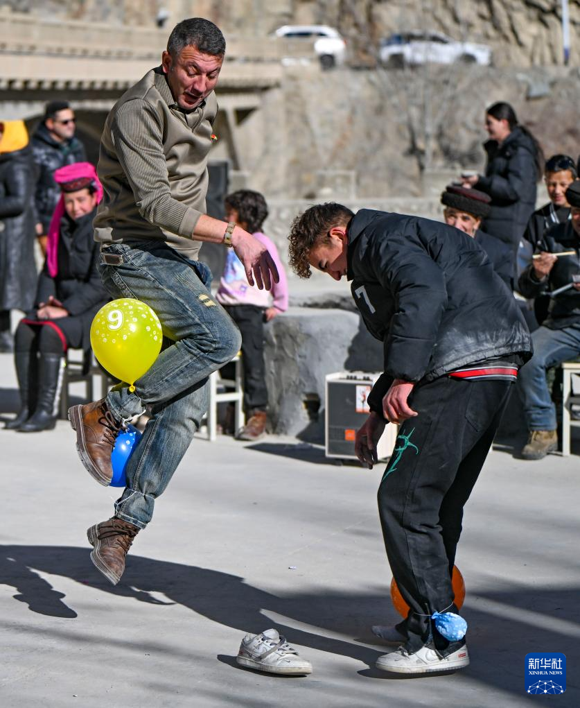 村民在大同鄉阿依克日克村的小廣場上參與踩氣球互動游戲(1月7日攝)。