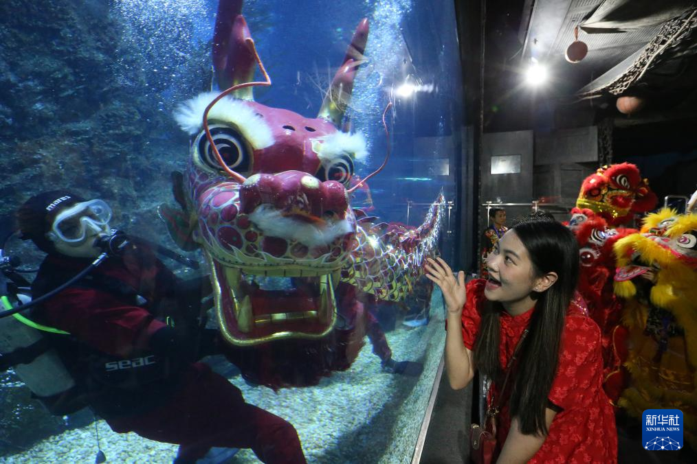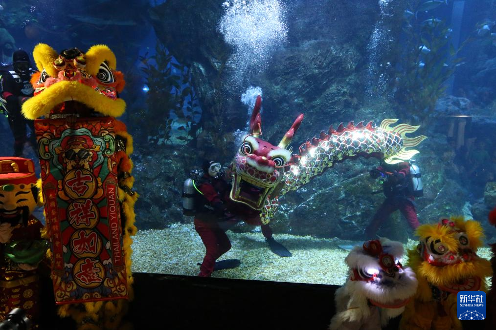 當日,位于泰國曼谷市中心的暹羅海洋世界舉辦迎新年活動,潛水員在水下表演舞龍,吸引市民前來觀賞。