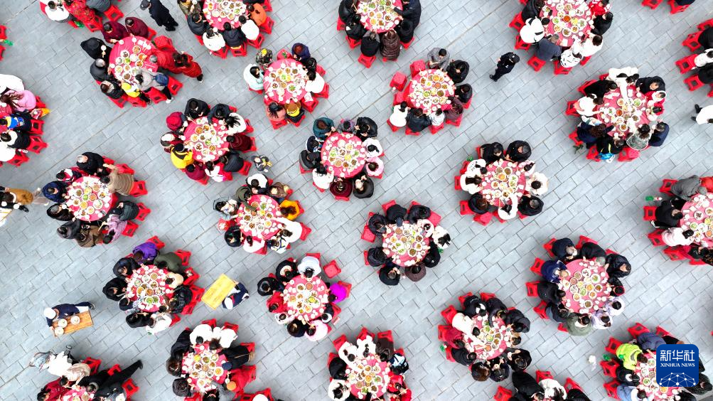 1月18日,四川省瀘州市江陽區華陽街道瑞景社區居民在品嘗百家宴(無人機照片)。