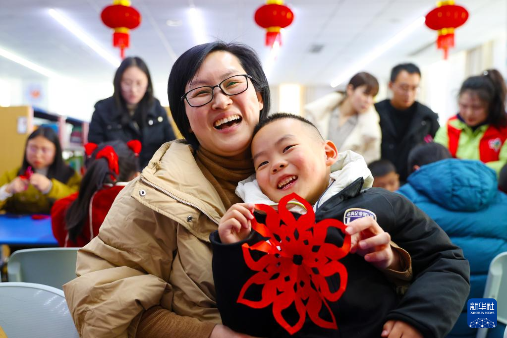 1月18日,重慶市黔江區“藏在‘年’里的民俗體驗公益活動”在區圖書館舉辦,一名家長和小朋友在展示剪紙作品。