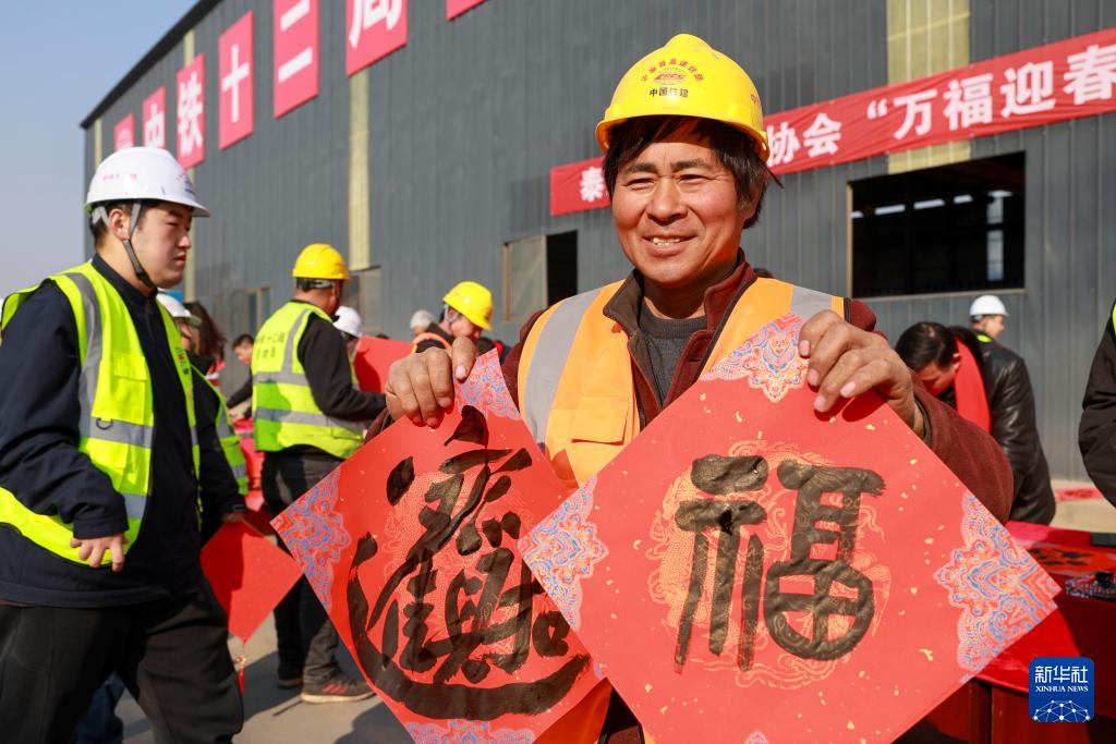1月19日,在江蘇省泰州市高鐵南站綜合交通樞紐項目現場,中鐵十二局建設者拿到泰州市書法家協會的書法家們書寫的“?!弊趾汀罢胸斶M寶”,開心地笑了。