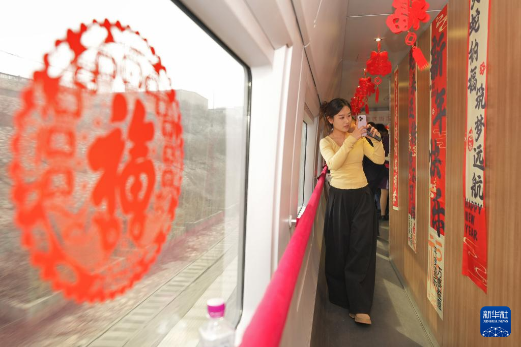 1月18日,旅客在山東榮成至北京南G1088次列車上拍攝新春布景。