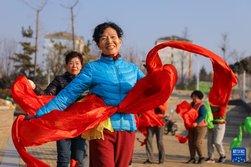 1月19日,山東省青島市李滄區世園街道畢家上流社區文藝隊員在排練扭秧歌。