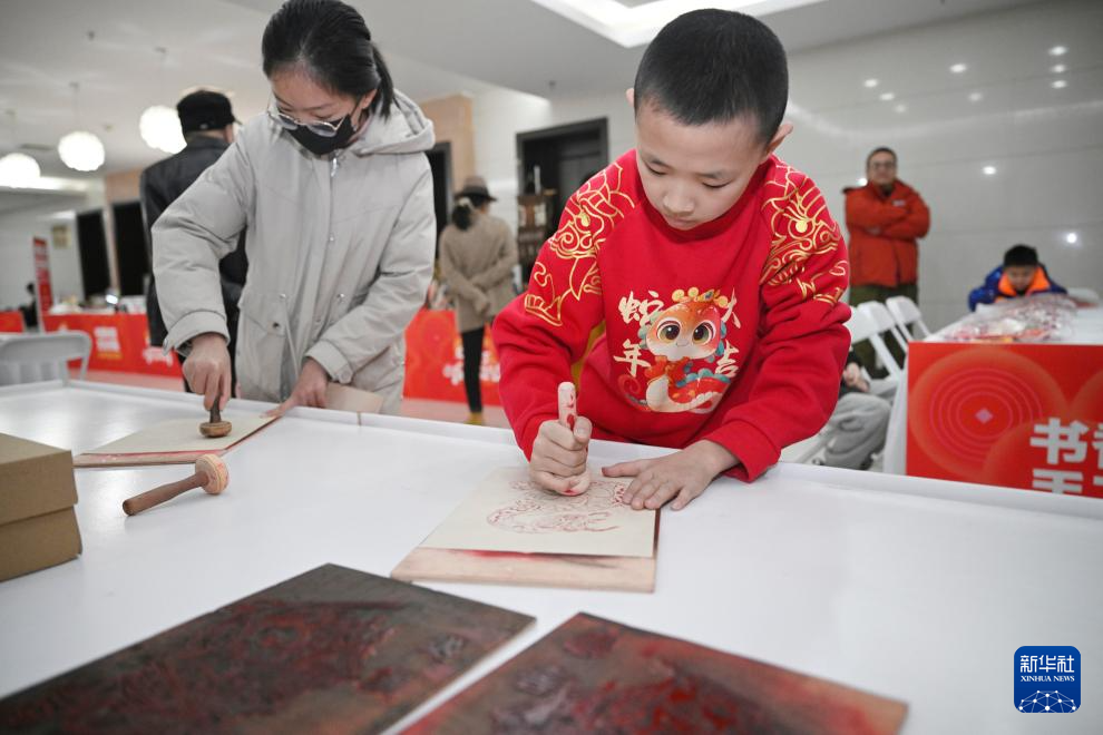 1月19日,在位于銀川的寧夏圖書館,小朋友在“書香迎春——圖書館里過大年”活動現場體驗版畫拓印。