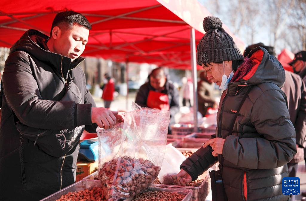 1月19日,北京市海淀區青龍橋街道的居民在“年味市集”上購買年貨。