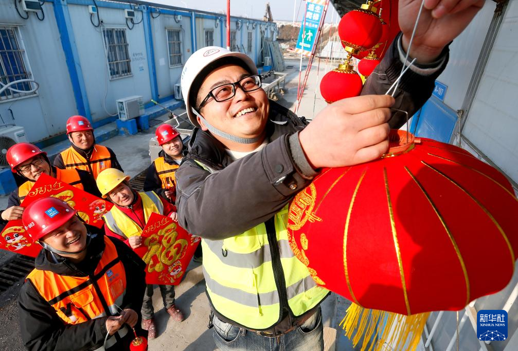 1月19日,在山東省膠州市國家獸醫公共衛生中心建設項目工地,中建八局四公司務工人員在生活區懸掛燈籠。