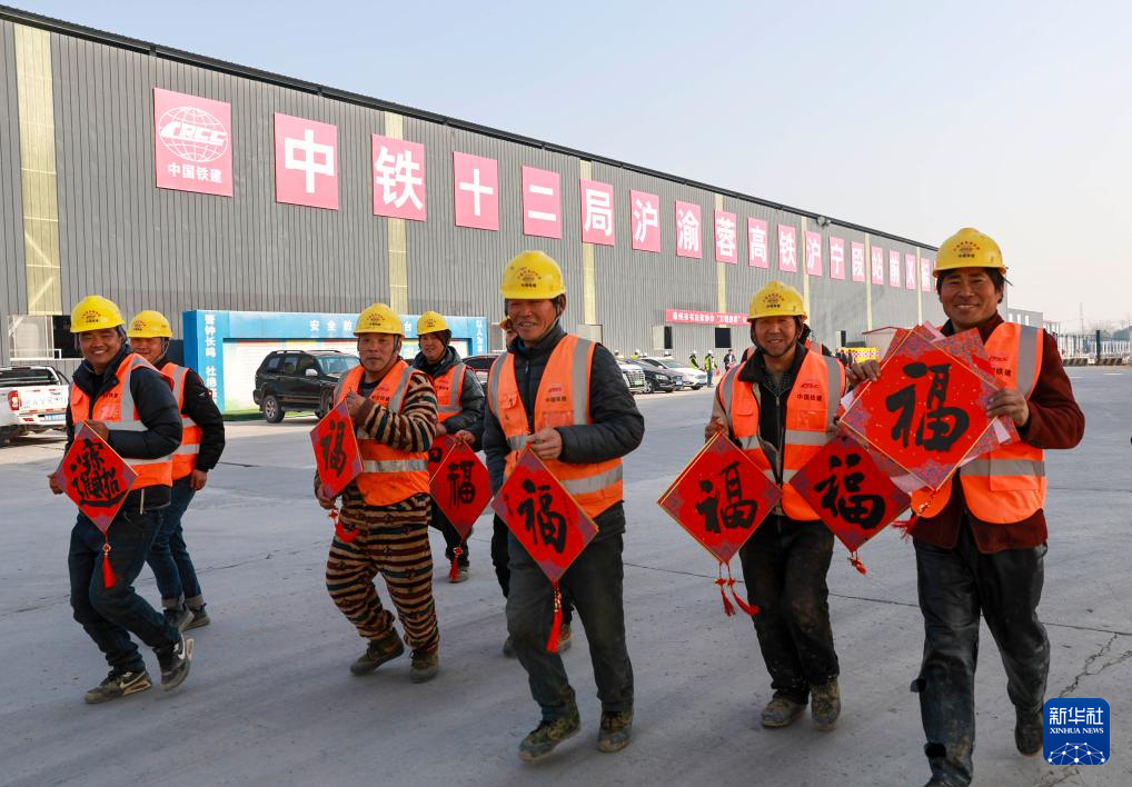 1月19日,在江蘇省泰州市高鐵南站綜合交通樞紐項目現場,中鐵十二局建設者展示泰州市書法家協會的書法家們書寫的“?!弊趾汀罢胸斶M寶”。