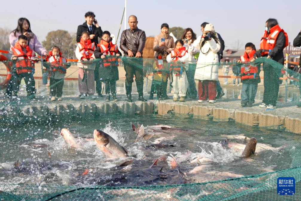 1月19日,在浙江省嘉興市南湖區湘家蕩“魚樂美市”年貨節上,小朋友和家長一起體驗拉網捕魚。