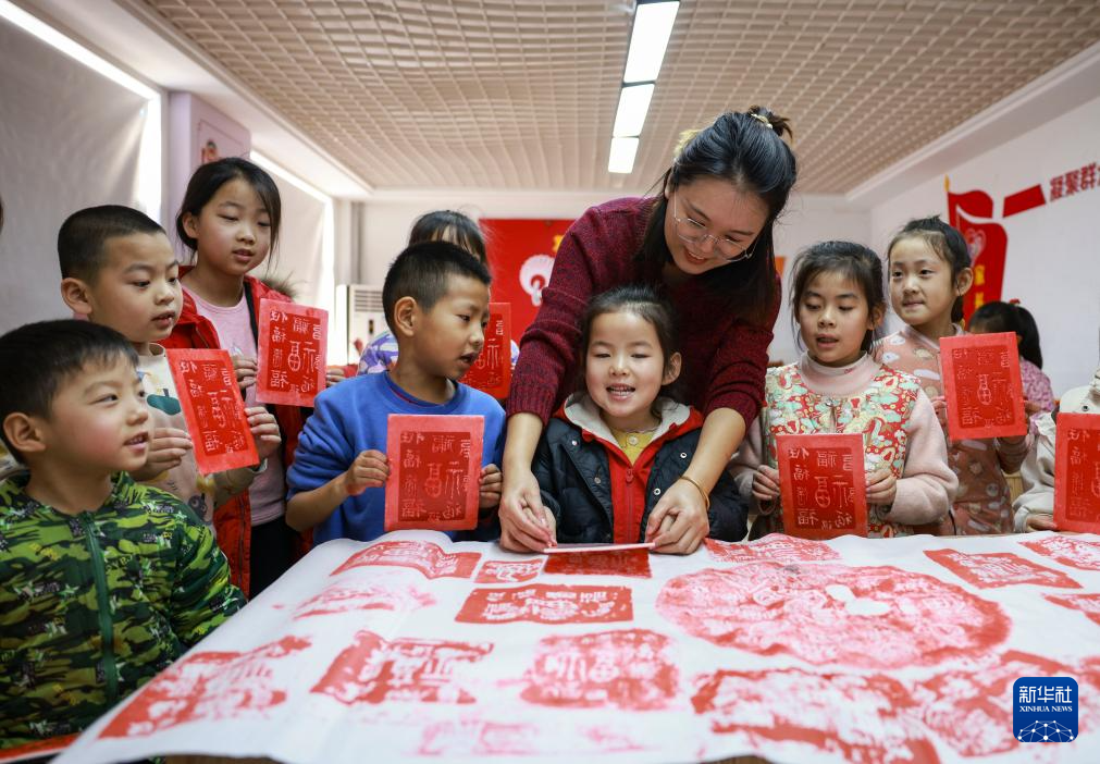1月19日,在山東省東營市廣饒縣李鵲鎮新時代文明實踐所,老師在教孩子體驗非遺拓印。
