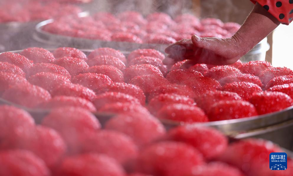 1月19日,貴州省銅仁市玉屏侗族自治縣田坪鎮白果村村民制作當地傳統過年食品紅粑。