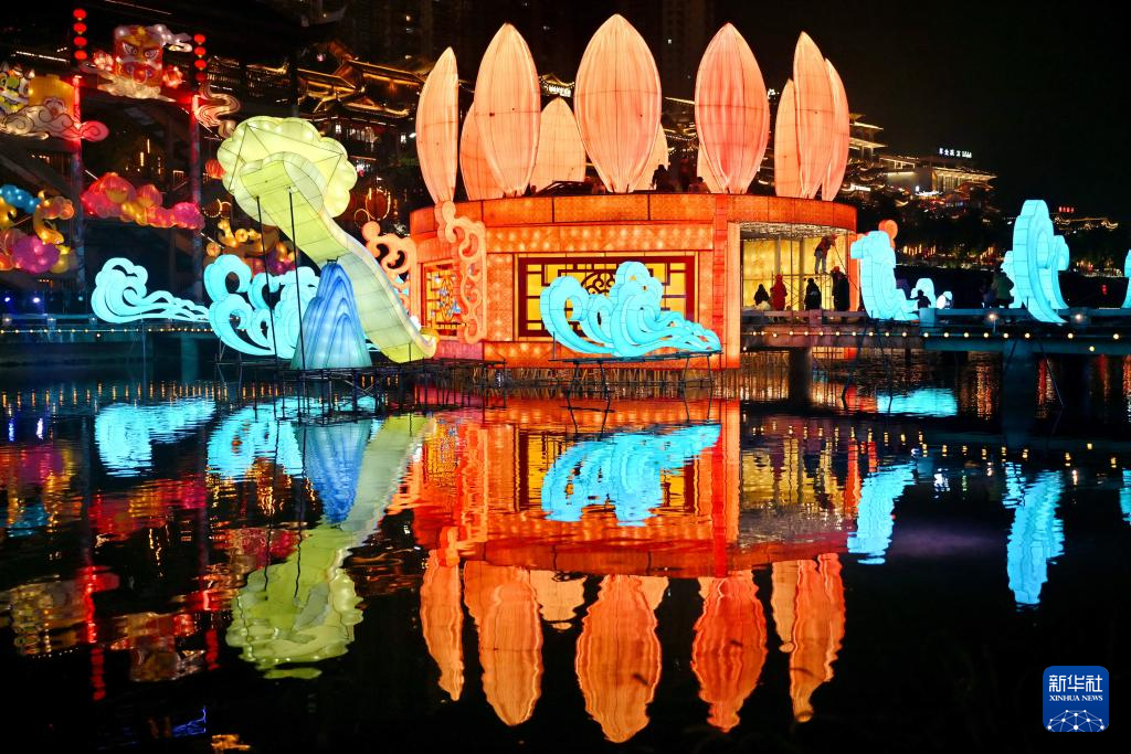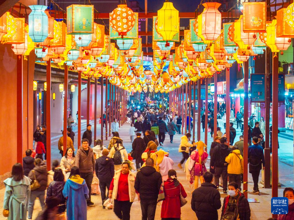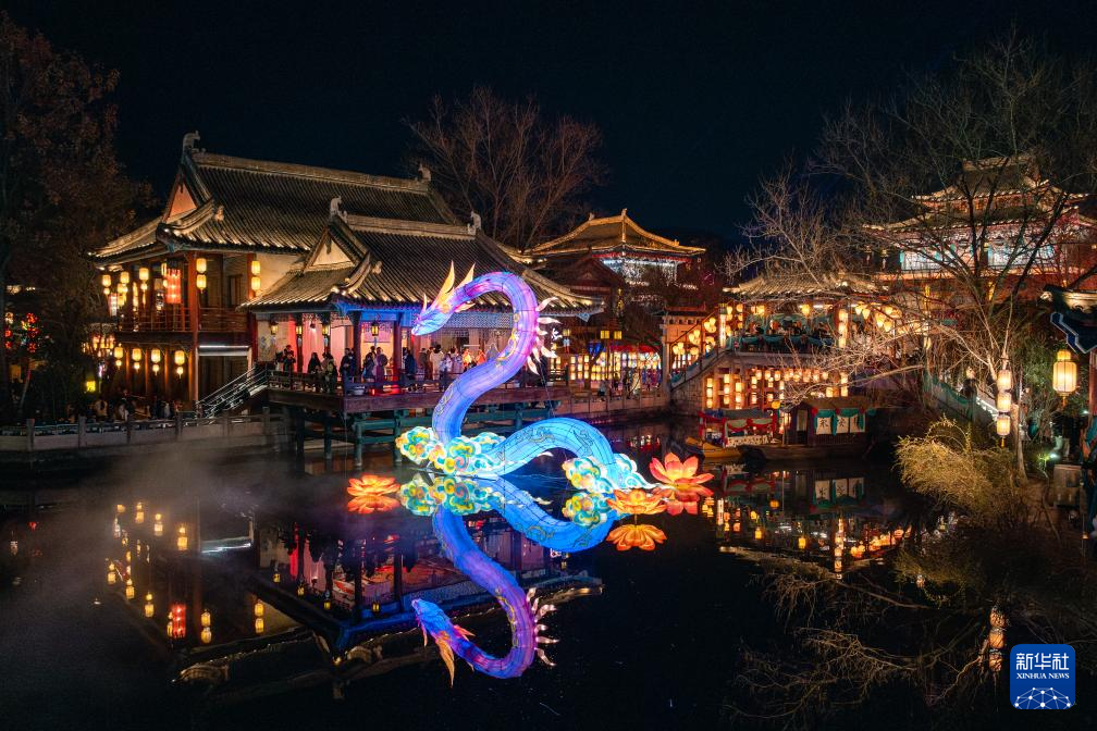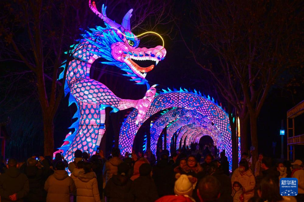 1月18日晚,河南洛陽2025年隋唐河洛文化廟會暨新春燈會試亮燈,吸引市民游客觀賞。