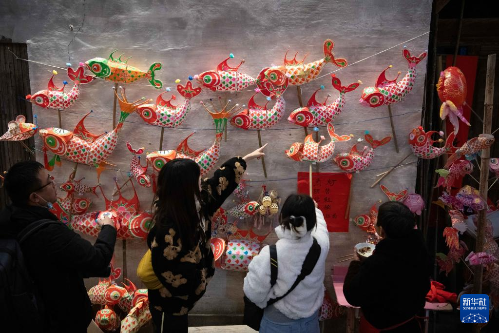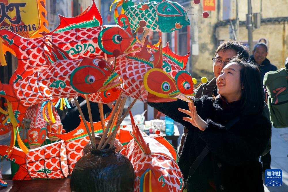 1月10日,在安徽省黃山市歙縣北岸鎮瞻淇村,游客在選購魚燈。