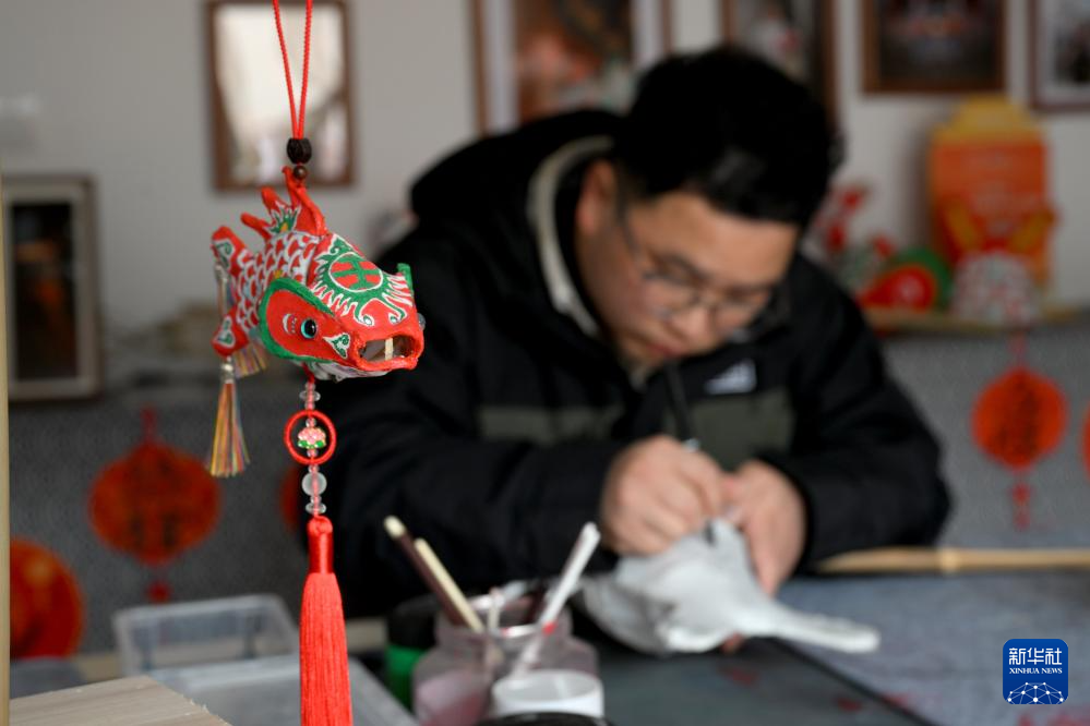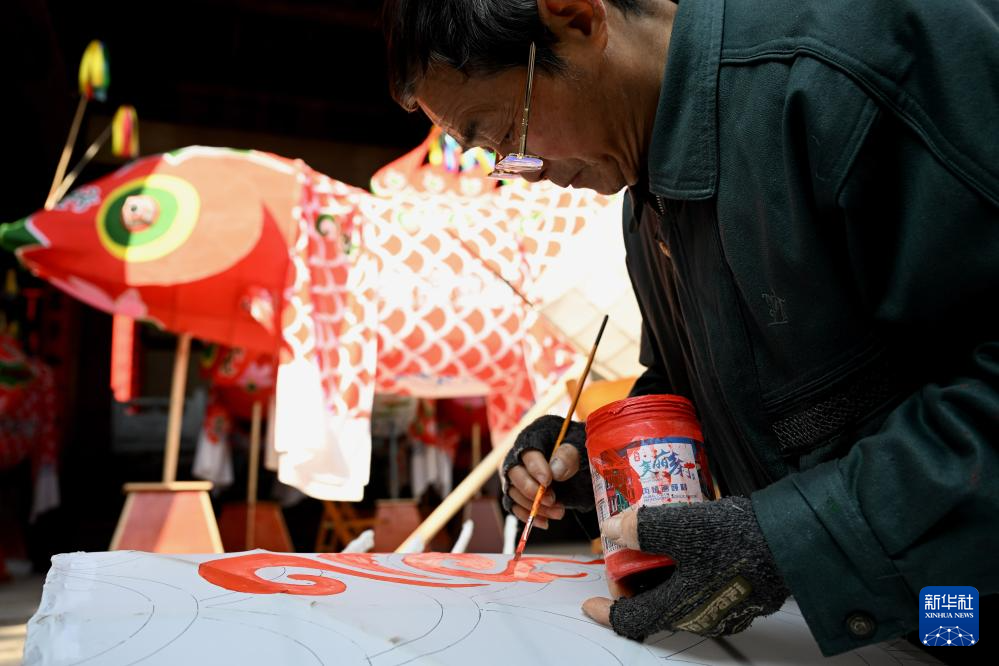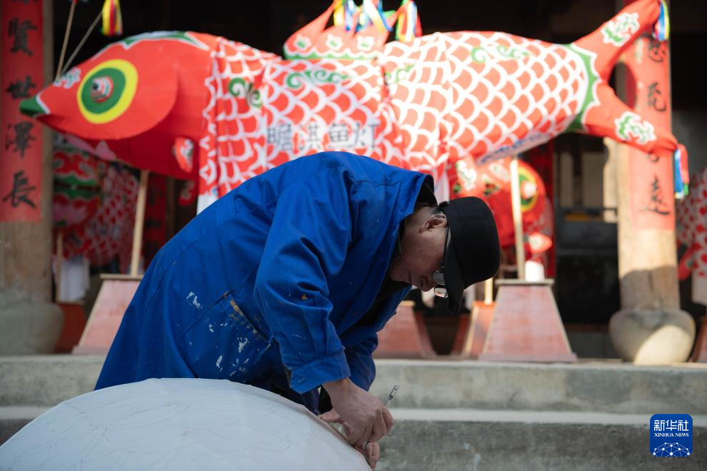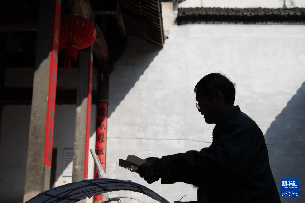 1月6日,在安徽省黃山市歙縣北岸鎮瞻淇村,瞻淇魚燈非遺傳承人汪宇昉在制作魚燈。