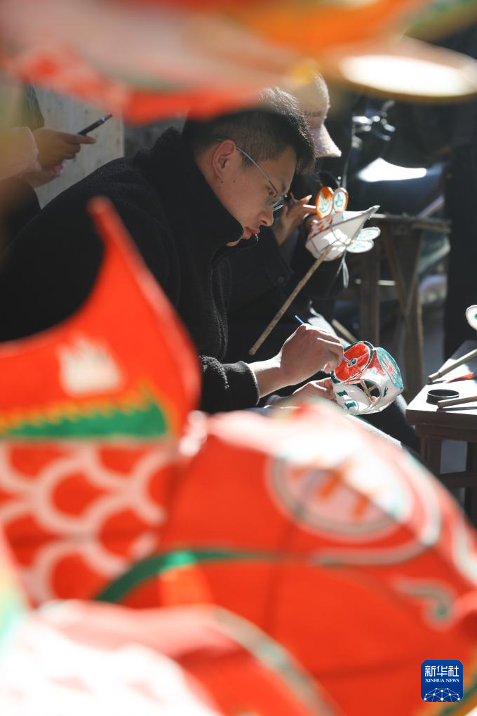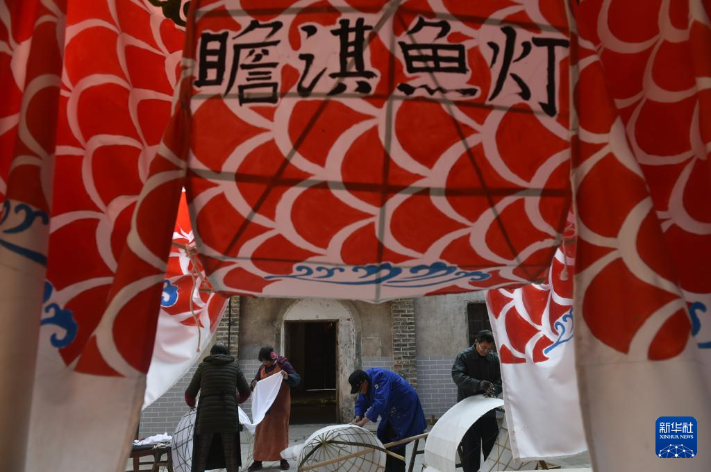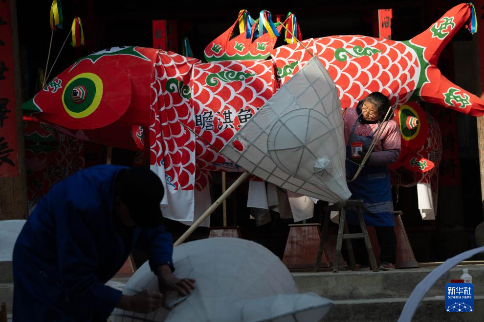 1月6日,在安徽省黃山市歙縣北岸鎮瞻淇村,村民在制作魚燈。