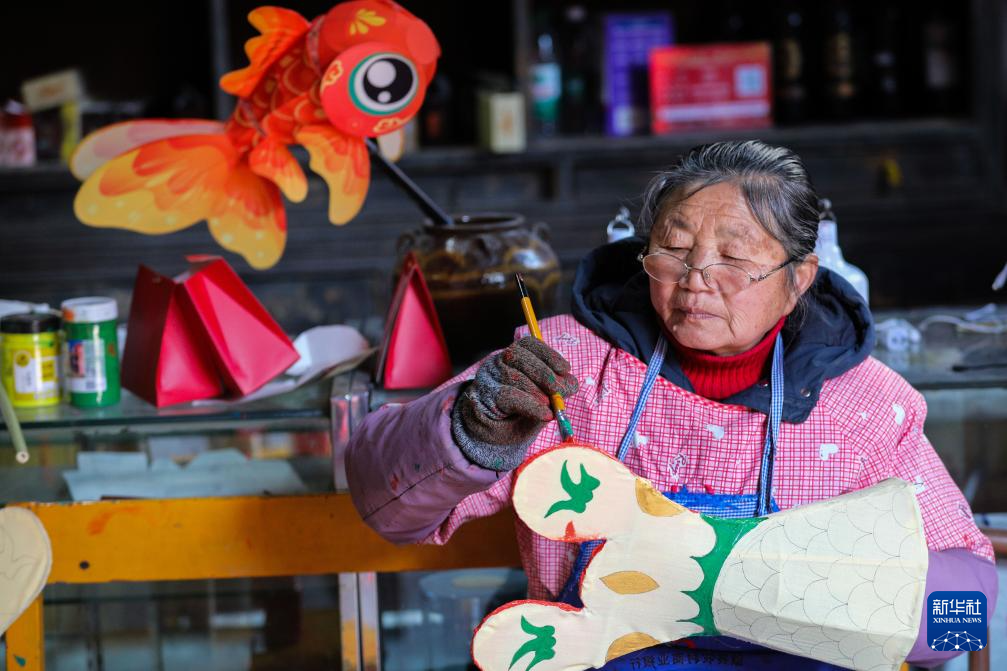 1月18日,在安徽省黃山市歙縣北岸鎮瞻淇村,村民汪文英在制作魚燈。