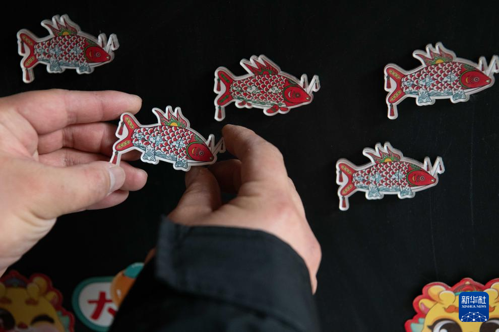 1月6日,在安徽省黃山市歙縣北岸鎮瞻淇村,瞻淇魚燈非遺傳承人汪宇昉展示自己設計的魚燈文創產品。