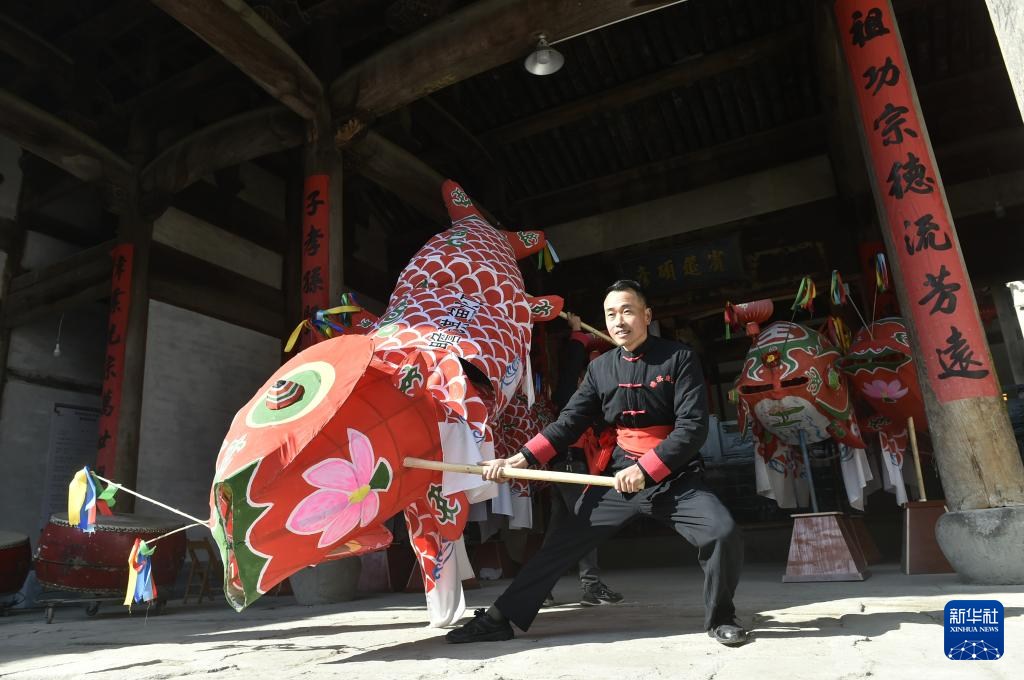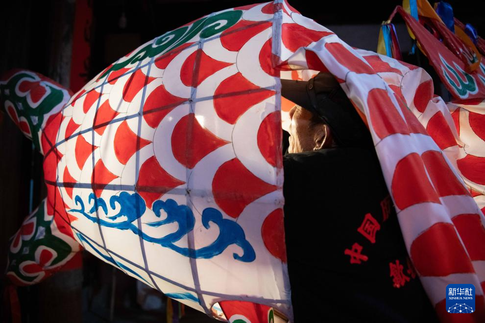 1月8日,在安徽省黃山市歙縣北岸鎮瞻淇村一處祠堂里,村民點亮魚燈,準備在村里舞燈。