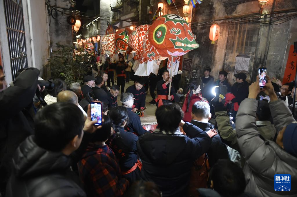1月10日,安徽省黃山市歙縣北岸鎮瞻淇村魚燈隊在村里表演。