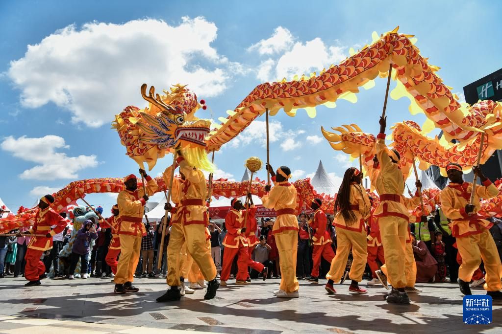 1月19日,演員在肯尼亞首都內羅畢舉行的中國春節廟會活動上表演舞龍