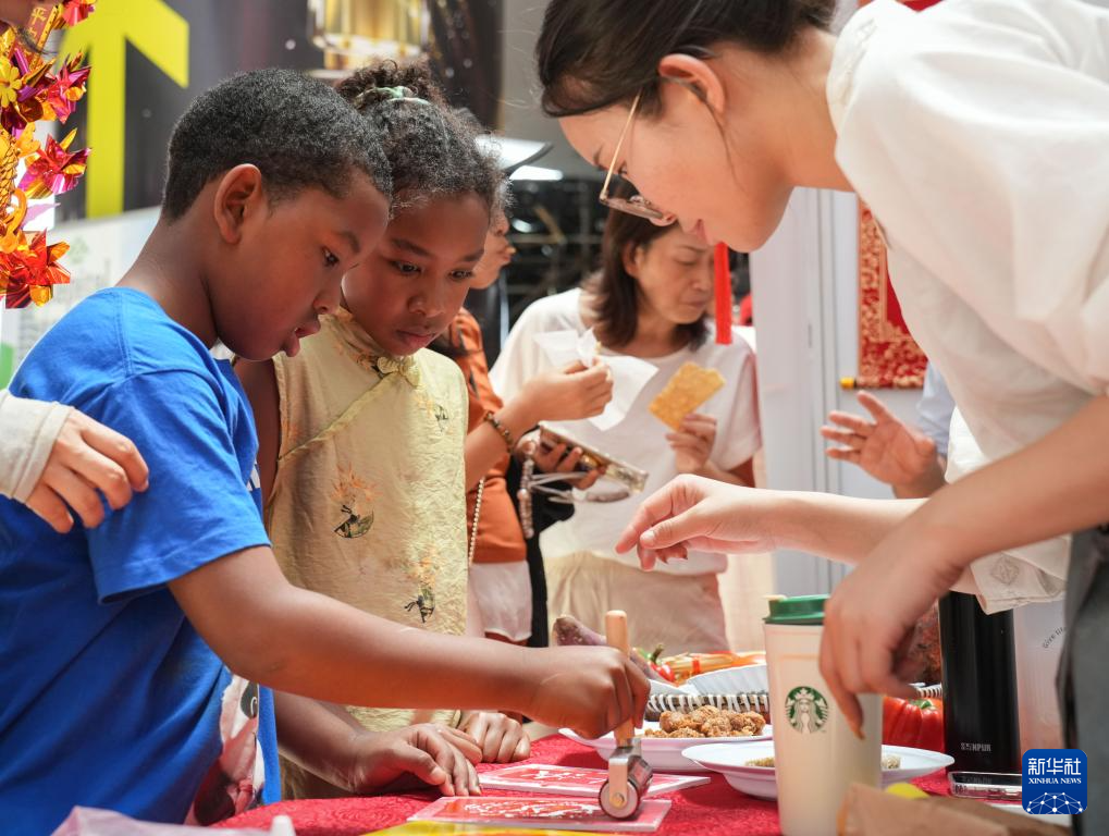 1月19日,孩子們在肯尼亞首都內羅畢舉行的中國春節廟會活動上體驗拓印技藝。