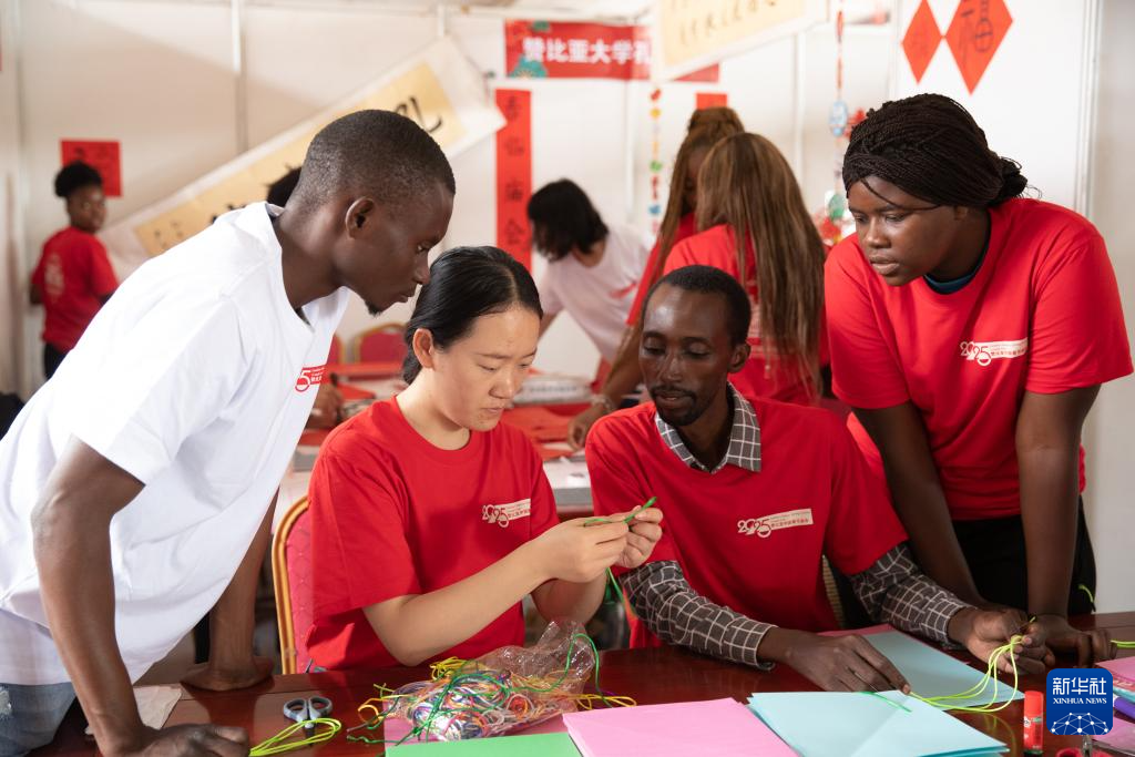 1月19日,在贊比亞首都盧薩卡舉行的春節廟會活動上,贊比亞大學孔子學院的師生編制中國結。