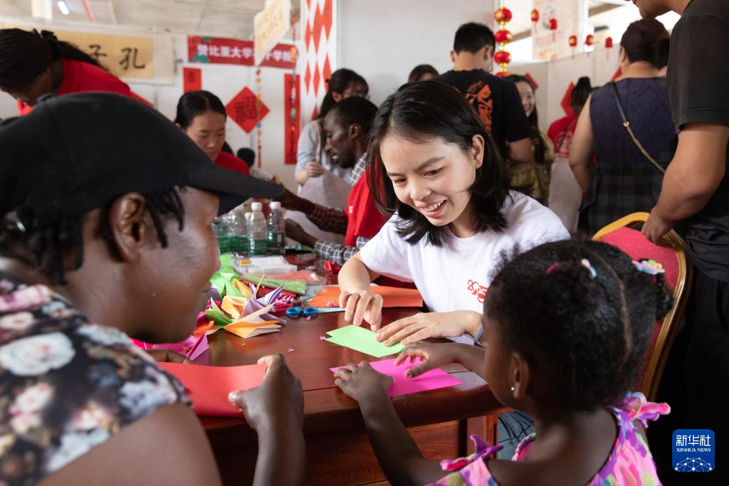 1月19日,在贊比亞首都盧薩卡舉行的春節廟會活動上,一名贊比亞大學孔子學院的老師教一名小朋友折千紙鶴。