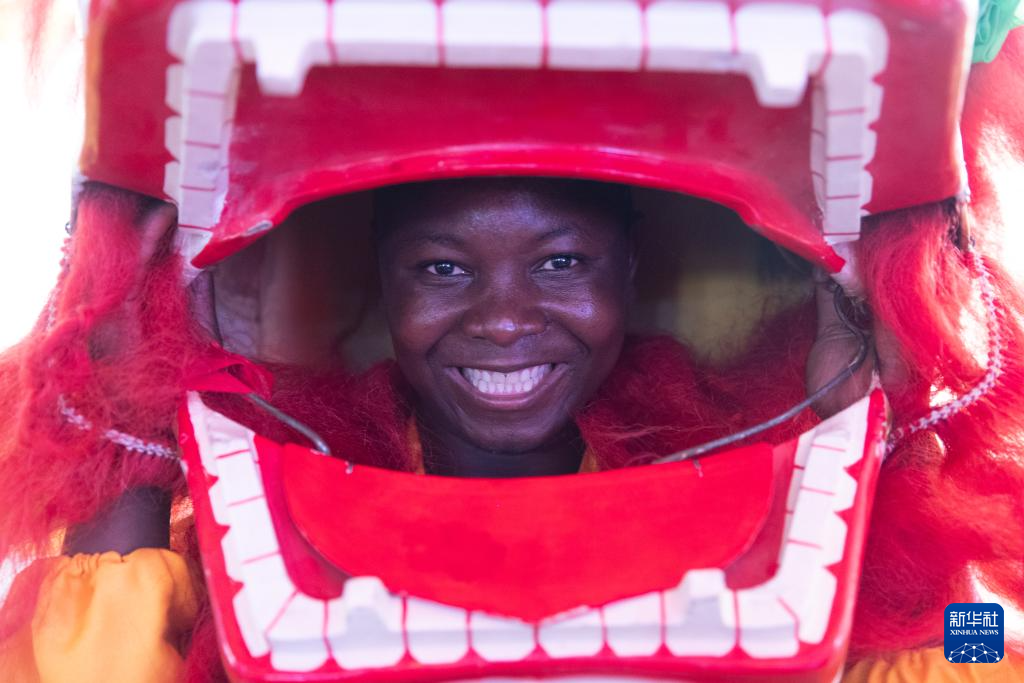 1月19日,在贊比亞首都盧薩卡舉行的春節廟會活動上,一名贊比亞武術協會成員準備表演舞獅。