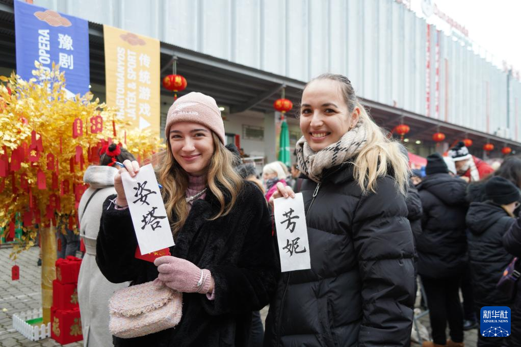 1月18日,兩名女子在匈牙利首都布達佩斯舉行的新春廟會活動上展示自己的中文名字。