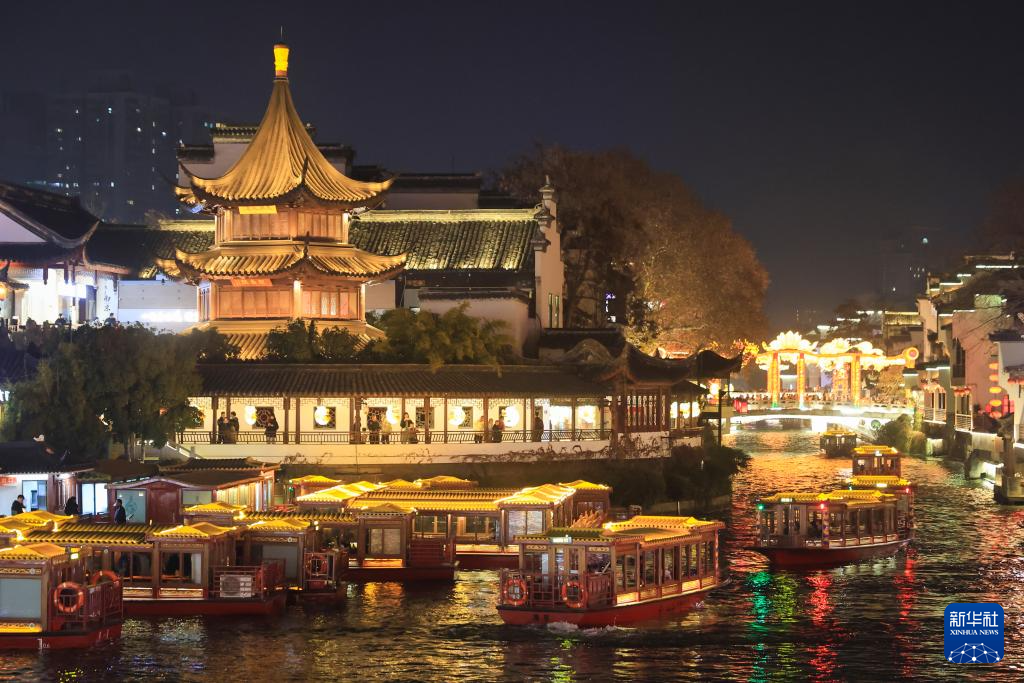 1月21日,游客在南京夫子廟景區乘坐游船賞燈游覽。