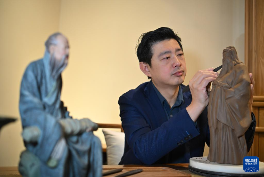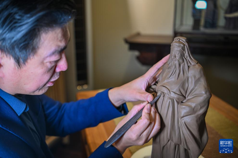 泥人張第六代傳承人張宇在天津古文化街泥人張美術館為新作品《福星》塑形(1月20日攝)。