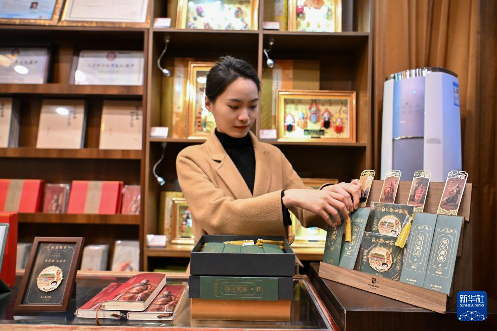 在天津古文化街泥人張世家,銷售人員在擺放文創產品(1月20日攝)。