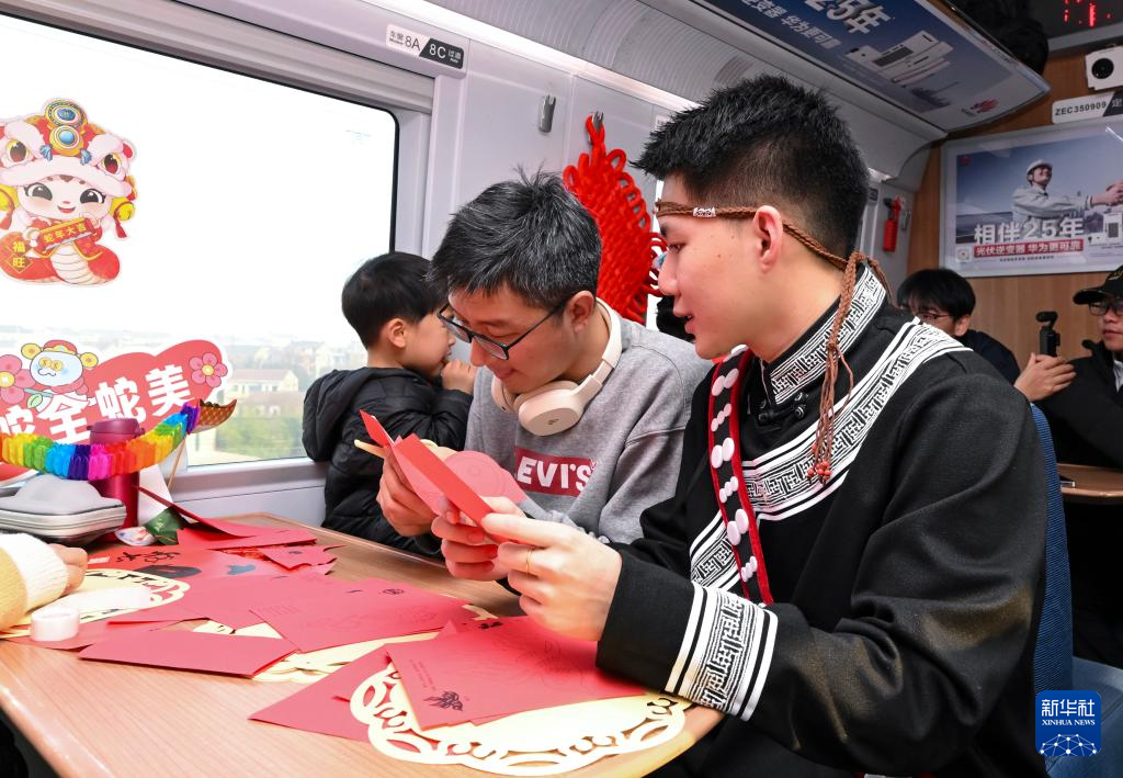 1月21日,身著彝族服飾的鐵路上??瓦\段職工鄭鑫(右)與旅客在車廂里剪窗花。