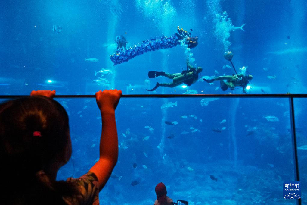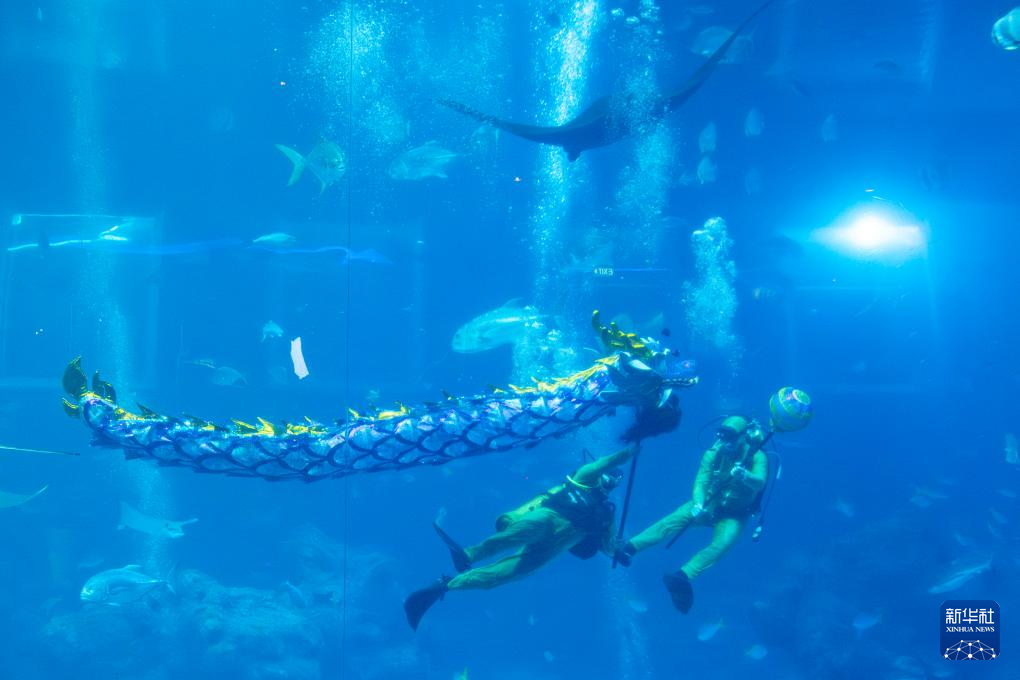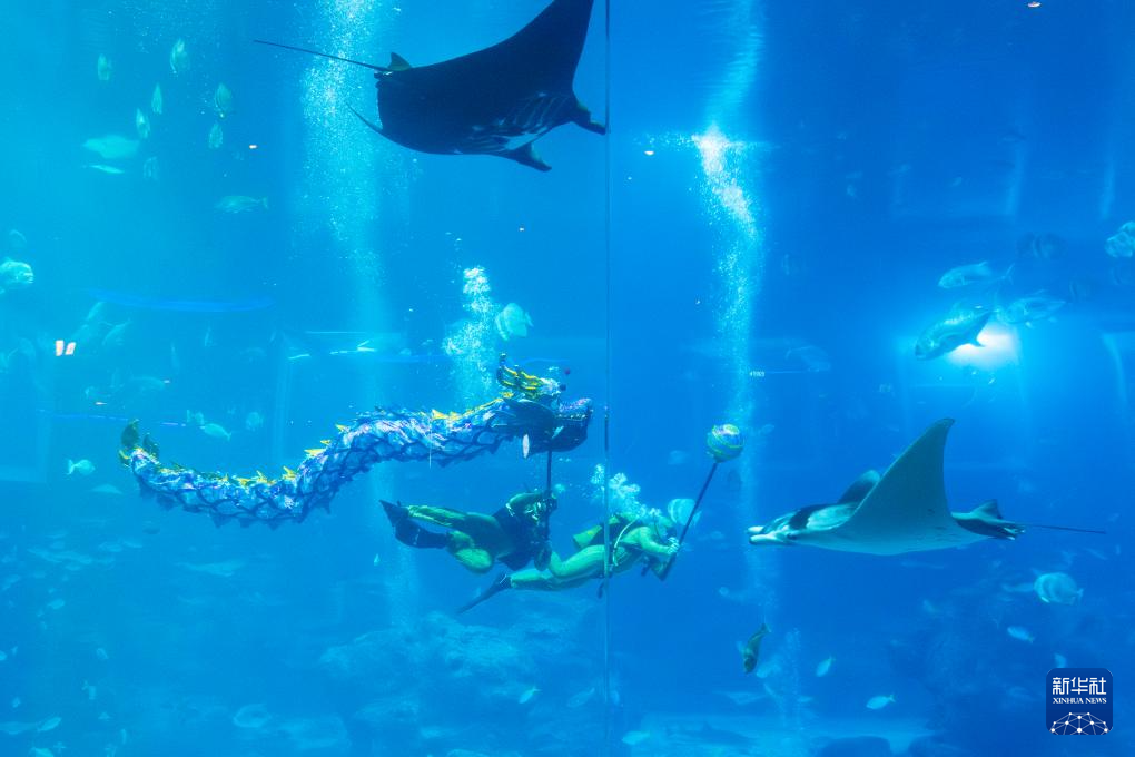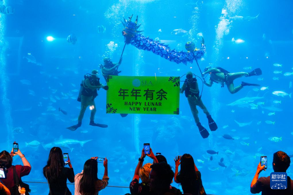 1月20日,潛水員在新加坡S.E.A.海洋館舉行的中國農歷新年慶?;顒由媳硌菟挛椠?。