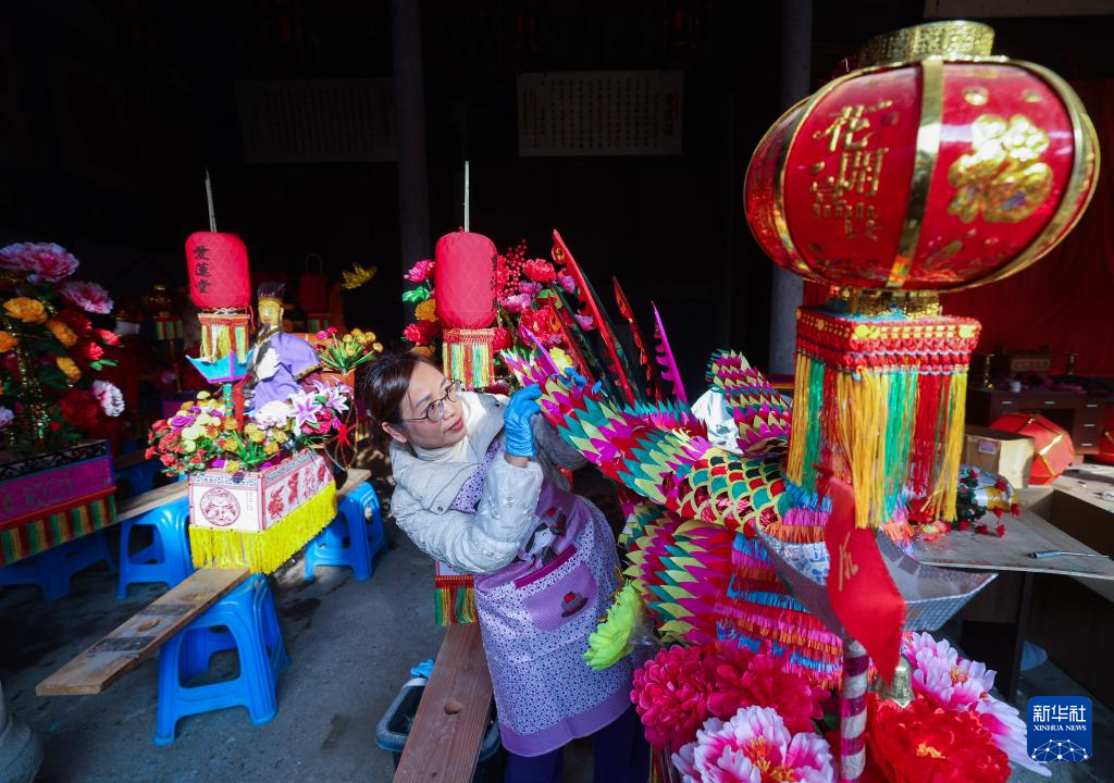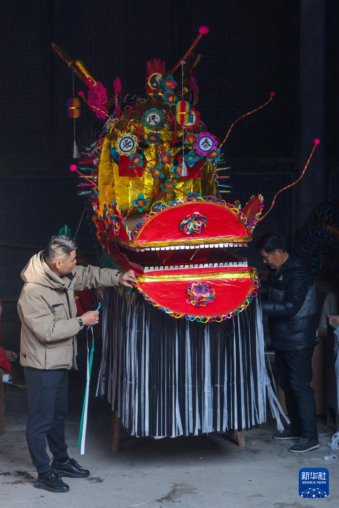 1月22日,在浙江省諸暨市安華鎮豐江周村,村民在裝飾板凳龍。