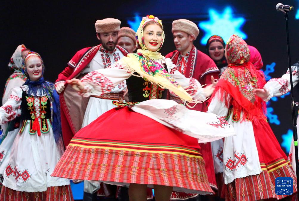 1月20日,在白俄羅斯首都明斯克,白俄羅斯學生在中白學生春節聯歡晚會上表演民族歌舞。